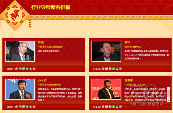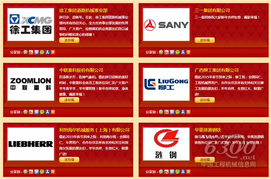 2015年2月15日,中国工程机械信息网(www.6300.net)携手中国叉车信息网(www.forktruck.cn)倾力推出“喜气洋洋 名企贺岁 2015工程机械行业贺岁金榜”活动。贺岁活动通过中国工程机械信息网以及中国叉车信息网的网站、微博、微信平台隆重举办,近百家知名工程机械企业、行业组织、行业专家等通过网络平台向全球华人、全行业朋友恭贺新禧,截至2015年3月31日,活动吸引了十多万名工程机械行业相关人士的关注,参与活动人数创下历史新高。