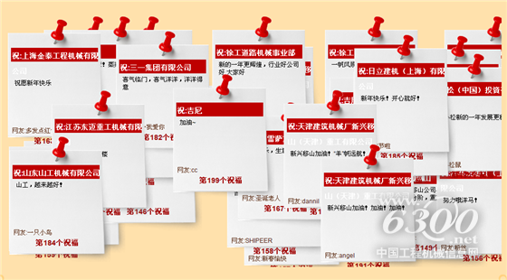 在春节期间,三一重工、中联重科、徐工、广西柳工、日立建机、华菱涟源钢铁、利勃海尔、福田雷萨、特利马克及中国工程机械工业协会等近百家知名企业、行业组织及多名行业导师纷纷在6300网发表新春贺词,热心企业为“羊年有礼”幸运大转盘等多个抽奖活动提供丰厚的奖品。