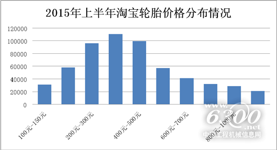 2015年上半年,线上轮胎的销售价格基本维持不变,从150元到1500元不等,而200-500元的轮胎价格区间依旧最受消费者欢迎,相较于之前各个月份变化不大。上半年度轮胎300-400元的成交量突破100000件大关。由此看出,平民化的价格仍然最受消费者的欢迎。