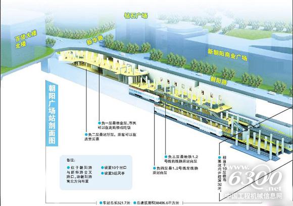 朝阳广场站位于朝阳广场商圈,车站周边交通流量大、施工场地狭小,部分地段基坑距施工围挡距离仅2.4m,开展水平及垂直运输吊装等作业时都受到场地的制约,施工组织难度相当大。