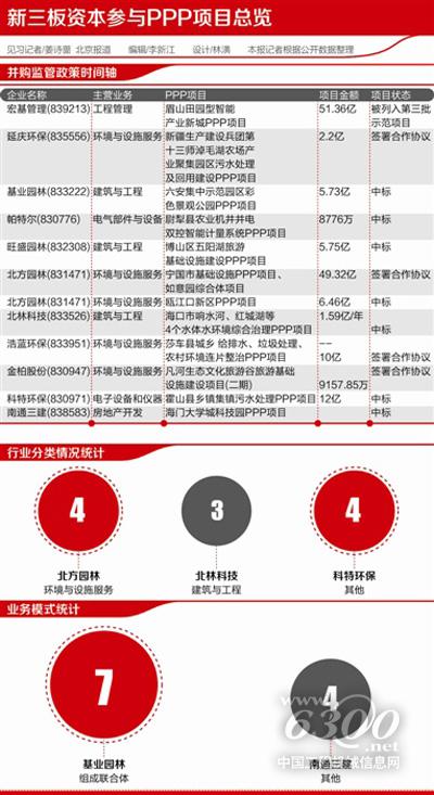 实际上,从行业来看,去年参与PPP项目的新三板企业所涉及的行业集中在园林、环保、建筑等市政基础领域,其中园林建设企业就有5家,环保企业也有3家。