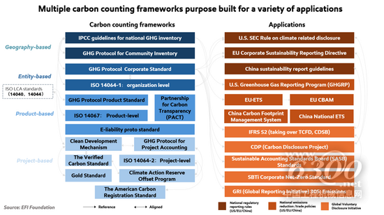当前全球范围内的碳核算与报告框架格局中,各类指南数量已超十余套,这些框架中大多是为特定目标设计,并涵盖多种类型,包括基于地域(即国家清单)、覆盖企业整体、聚焦产品生命周期以及以项目为核心的核算。这其中聚焦企业层面报告的框架应用最为广泛,而那些支持基于产品全生命周期分析的框架,在国家政策或全球自愿性倡议中的应用则相对较少。