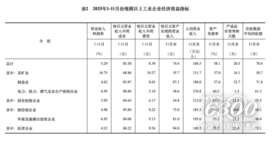 11月末,规模以上工业企业资产总计189.28万亿元,同比增长4.8%;负债合计109.96万亿元,增长5.0%;所有者权益合计79.32万亿元,增长4.5%;资产负债率为58.1%,同比上升0.1个百分点。