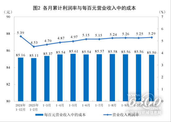 11月份,规模以上工业企业每百元营业收入中的成本为85.50元,同比增加0.18元;每百元营业收入中的费用为8.39元,同比减少0.06元。