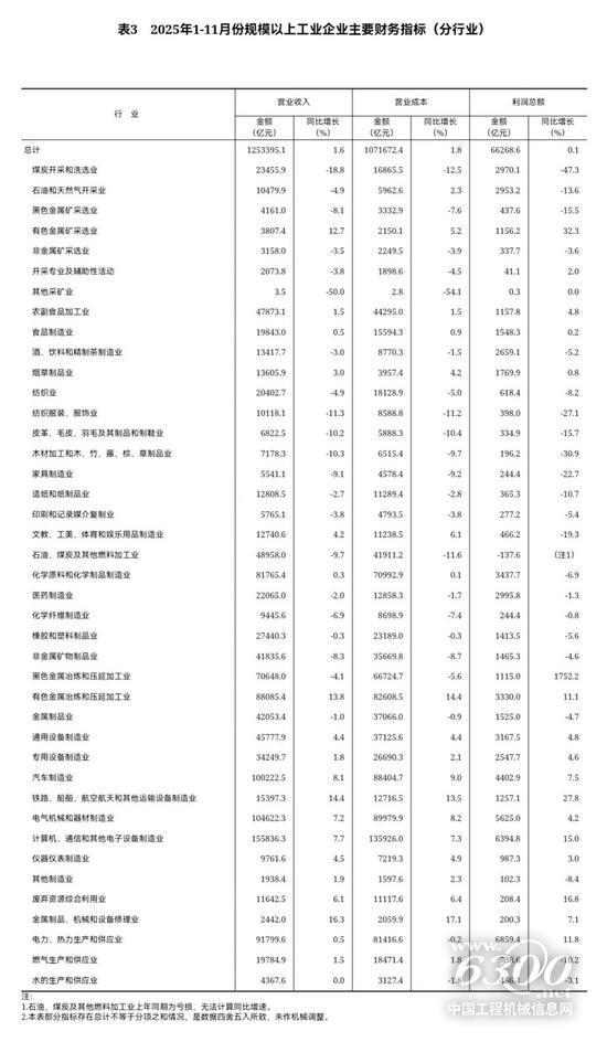 11月份,全国规模以上工业企业实现利润总额66268.6亿元,同比增长0.1%(按可比口径计算,详见附注二)。