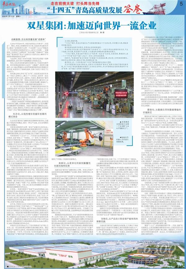 “十四五”时期是中国制造向中国智造、中国创造转型的关键五年,双星的实践与发展正是这一进程的生动缩影。双星以“新四化”战略为指引,不仅在橡胶轮胎、智能装备、循环利用三大板块构建起协同发展的产业新生态,更在全球化布局、绿色制造、数字融合等方面树立了行业新标杆。双星的创新与实践,已成为推动青岛制造迈向世界级、引领中国轮胎产业转型升级,乃至为全球制造业可持续发展提供中国智慧的重要力量。
