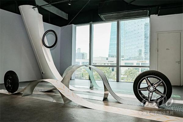 其中轮胎装置部分,选取了正新轮胎五款主力产品的经典纹样,通过起伏错落的形态设计,生动模拟出轮胎翻山越岭、驰骋四方的功能特性与应用场景。装置现场同步陈列三款正新代表性轮胎产品,以实物展品让观众近距离感知可持续供应链下的终端产品魅力。