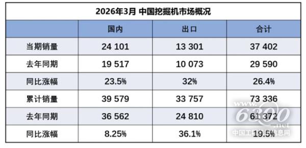 据中国工程机械工业协会对挖掘机主要制造企业统计,2026年3月销售各类挖掘机37402台,同比增长26.4%。其中:国内销量24101台(含电动挖掘机43台),同比增长23.5%;出口13301台(含电动挖掘机33台),同比增长32%。
