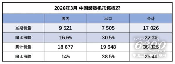 据中国工程机械工业协会对装载机主要制造企业统计,2026年3月销售各类装载机17026台,同比增长22.3%。其中:国内销量9521台(含电动装载机4864台),同比增长16.6%;出口7505台(含电动装载机299台),同比增长30.5%。