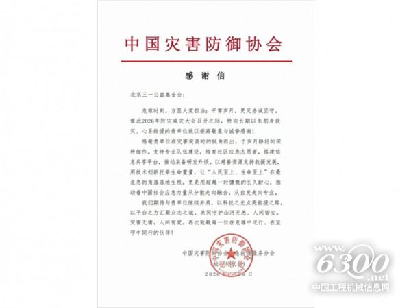 三一基金会持续积极与全国各地基层救援队伍建立深度合作关系,依托三一集团的产业优势,为多个救援队伍配备应急救援器材装备、提供专业救援技术指导和培训支持,增强基层队伍的风险防范、先期处置和自救互救能力,推动“企业+社会组织+一线队伍”的协同应急救援模式落地见效。凭借在历次灾害突袭时的挺身而出,用实际行动践行“人民至上,生命至上”的使命担当,三一基金会获中国灾害防御协会颁发感谢信。