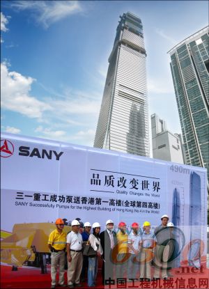 于2005年7月开始动工建设,三一重工4台拖泵和2台32米布料杆配合施工,承担全部的C90标号的30多万立方米混凝土泵送任务。值得一提的是,香港环球贸易广场46层以下2008年便已启动办公,边建边启用的特殊性,使得环保施工的要求更加突出。三一首创的超高压拖泵“静音作业”,和世界独一无二的超高压管道水洗技术,在东方明珠树立起超高层绿色建筑的风范,超高压水洗技术为香港环球贸易广场节约费用超过200万港币。